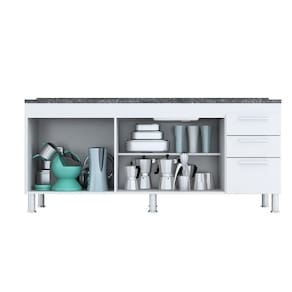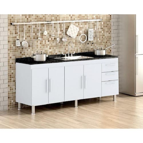 Este gabinete é produzido especialmente para pias de 1,80m possui 3 gavetas com corrediças metálicas para melhor armazenar os itens de cozinha e conta com uma prateleira profunda completa no seu interior. Possui puxadores modernos e 5 pés para evitar empenamento da base, o gabinete é totalmente fabricado em MDP de 12mm, aumentando a durabilidade, resistência e qualidade do produto. O gabinete NÃO ACOMPANHA o tampo da imagem. Além desses detalhes possui uma fácil montagem.