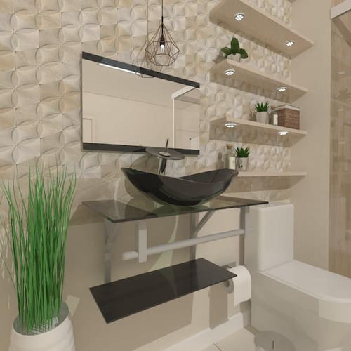 espessuras: - bancada de vidro: 8 mm - cuba de vidro: 10 mm - prateleira bancada: 5 mm - espelheira: 3 mm
