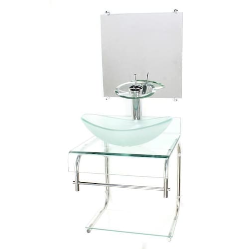 Espessuras: - Bancada de vidro: 10mm. - Cuba de vidro: 10mm. - Prateleira da bancada: 5mm. - Espelho: 3mm.