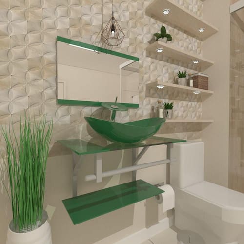 Gabinete de vidro 45cm ac com cuba oval verde Os nossos gabinetes são indicados para projetos arrojados e de muito bom gosto, além de valorizar o seu ambiente com sofisticação em uma decoração de alto padrão, ele consegue usufruir das vantagens que o vidro proporciona e gerar uma durabilidade indiscutível, sem contar que com as várias opções de cores, você sempre poderá encontrar uma cor perfeita para o seu banheiro. Itens inclusos: - bancada de vidro com furo para torneira 3,5cm diâmetro e válvula click 4,5cm diâmetro ; - cuba de vidro oval; - espelho; - estrutura e porta toalha de aço carbono com pintura eletrostática cinza; - kit parafusos completo para instalação; - prateleira de vidro da bancada; - válvula click. Dimensões: - bancada de vidro: 45 x 45cm largura x profundidade - cuba de vidro oval: 38 x 26cm comprimento x profundidade - prateleira bancada: 45 x 20cm largura x profundidade - espelheira: 45 x 45cm largura x altura - porta toalha: 45cm largura - válvula: 1 1/4 Espessuras: - bancada de vidro: 8 mm - cuba de vidro: 10 mm - prateleira bancada: 5 mm - espelheira: 3 mm : 12 meses conforme política de troca e devoluções . Atenção: preço referente somente ao gabinete, não acompanha torneira, sifão e acessórios. Montagem: montagem e instalação não inclusa na venda ou preço do produto, elas são de inteira responsabilidade do cliente. Imagens ilustrativas. Ean: 7909752262243