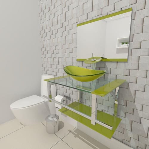 Espessuras: - Bancada de Vidro: 8 mm - Cuba de Vidro: 12 mm - Prateleira Bancada: 6 mm - Espelheira: 3 mm