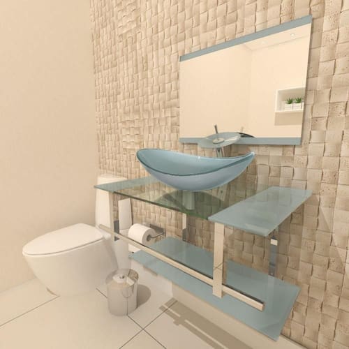 espessuras: - bancada de vidro: 8 mm - cuba de vidro: 10 mm - prateleira bancada: 5 mm - espelheira: 3 mm