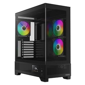 O design do Atlas M1 é sofisticado, com frente e lateral esquerda em vidro temperado que permitem visualizar o interior do sistema, realçado pelas três fans ARGB de 120mm incluídas, proporcionando um show de luzes e resfriamento eficiente. O gabinete também possui um display integrado que exibe informações cruciais para o monitoramento do hardware, facilitando a manutenção e a performance do sistema.