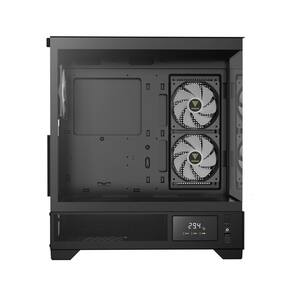 A conectividade do painel frontal é robusta, apresentando uma porta USB 3.0, uma porta USB-C e uma entrada de áudio HD, além de botões de power, led e monitor para um controle fácil e rápido do sistema. O suporte para fans é amplo, acomodando até três fans de 120mm ou dois de 140mm na parte superior, duas fans de 120mm na lateral duas já pré-instaladas , e uma fan de 120mm na parte traseira pré-instalada .