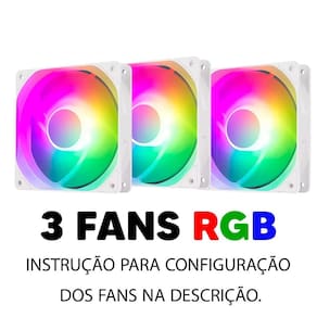 Gabinete Gamer Branco Mid Tower RGB ATX Vidro GB1793 hayom Acompanha 3 fans RGB gerenciáveis Visão geral Lateral vidro temperado 4mm Frontal vidro temperado 4mm Especificações técnicas Placa - mãe compatível: ATX / MICRO ATX / MINI ITX. Dimensões do gabinete AxLxP : 447310192mm Altura da CPU cooler: 160mm Suporte para placa de vídeo: até 310mm Fontes de alimentação compatíveis: padrão ATX parte inferior Portas USB: 2 x 2.0 + 1 x 3.0 Baias internas: 13.5 HD e / ou 2 2,5 SSD Slots de expansão: 7 Chassi 0,5mm Refrigeração Superior: 2 fans de 120x120mm incluso Traseira: 1 fan de 120x120mm incluso Inferior: 2 fans de 120x120mm Não incluso Compatível com water cooler de 120mm traseiro, 240mm superior interna Embalagem Quantidade: 01 peça por caixa Peso líquido: 3.4k Peso bruto: 3.8 k do vendedor: 3 meses fabricante: 12 meses Atenção todos os fans tem que ser ligados em serie na ordem.. 1º plug branco Adaptador molex 2º Fan master molex que sai um fio com adaptador 3º Restante dos molex O Fan master sai um adaptador nele tem que ser ligado o conector RESET para gerenciamento dos fans Marca: Não Informado