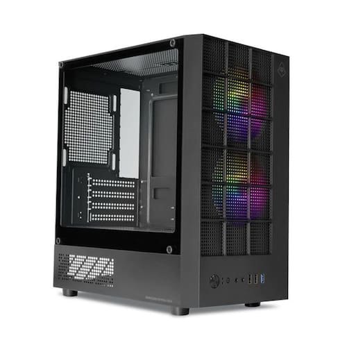 O painel frontal oferece conectividade prática com 1x USB 3.0, 1x USB 2.0 e entrada para áudio HD. Fabricado em estrutura SPCC e ABS, o gabinete entrega durabilidade, estética moderna e ótimo custo-benefício, sendo ideal para quem busca montar um computador gamer compacto e com aparência premium.