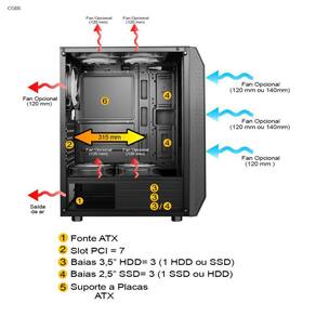 Gabinete gamer pixxo cg05 s/ coolers atx s/ fonte Gabinete gamer pixxo cg05 s/ coolers atx s fonte preto O gabinete gamer pixxo cg05, possui um filtro magnético anti-poeira na parte superior, a lateral possui uma lateral acrílica, o gabinete suporta placa mãe atx e o slot da fonte fica localizado na parte inferior do gabinete. Áudio frontal Hd áudio Baias para hd 3,5 - 3 1 compartilhada com ssd Baias para ssd / hds 2,5 - 3 1 compartilhada com hd Cor Preto Espessura da chapa 0.5mm spcc Fontes suportadas Atx Medidas do gabinete c x l x a 375 x 215 x 439 mm Pci profile Full profile Peso 3.2kg Placas suportadas Atx Portas usb 2.0 2 Portas usb 3.0 1 Quantidade de coolers suportados Frontal: 3x120mm ou 2x140mm Traseira: 1x120mm Teto: 2x120mm Inferior: 2x120mm Quantidade de slots pci 7 Marca: Não Informado