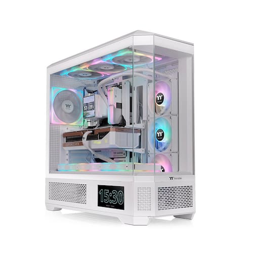 O View 600 TG Snow da Thermaltake é um gabinete Full Tower combina estrutura robusta com visual marcante e sofisticado com seu design na cor branca. Com quatro painéis de vidro temperado de 4 mm, oferece ampla visibilidade dos componentes e acabamento premium. Compatível com placas-mãe E-ATX, incluindo modelos com conectores ocultos da ASUS, MSI e GIGABYTE. Conta com espaço para até dez ventoinhas de 120/140 mm e radiadores de até 420 mm, entregando excelente fluxo de ar. Os slots PCI-E rotativos permitem instalação horizontal ou vertical da GPU (com riser opcional), e o suporte integrado evita o empenamento da placa. Filtros de poeira no topo, base e lateral protegem o sistema, enquanto a estrutura interna acomoda até três HDDs e três SSDs. O painel I/O no topo oferece conexões USB 3.0, USB-C e áudio HD.
