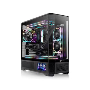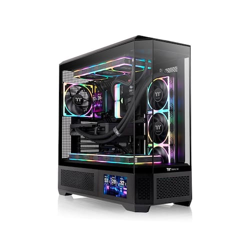 O View 600 TG da Thermaltake é um gabinete Full Tower combina estrutura robusta com visual marcante e sofisticado com seu design na cor preta. Com quatro painéis de vidro temperado de 4 mm, oferece ampla visibilidade dos componentes e acabamento premium. Compatível com placas-mãe E-ATX, incluindo modelos com conectores ocultos da ASUS, MSI e GIGABYTE. Conta com espaço para até dez ventoinhas de 120/140 mm e radiadores de até 420 mm, entregando excelente fluxo de ar. Os slots PCI-E rotativos permitem instalação horizontal ou vertical da GPU (com riser opcional), e o suporte integrado evita o empenamento da placa. Filtros de poeira no topo, base e lateral protegem o sistema, enquanto a estrutura interna acomoda até três HDDs e três SSDs. O painel I/O no topo oferece conexões USB 3.0, USB-C e áudio HD.