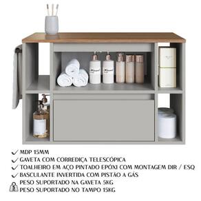 Gabinete para Banheiro, design funcional que alia praticidade e organização ao ambiente. Estrutura em MDP/MDF com acabamento em pintura UV texturizada. Conta com toalheiro lateral (em aço com pintura epóxi), gavetão com corrediças telescópicas, nichos decorativos funcionais e abertura tipo cava, além de porta basculante invertida com sistema de abertura por pistão a gás. Fixação por meio de parafusos. Este produto será entregue em 1 volume.