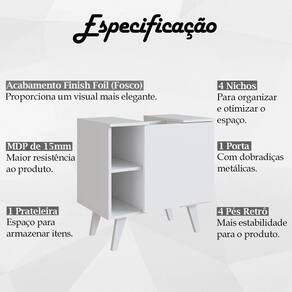 Gabinete Para Banheiro 01 Porta e 4 Nichos B86, uma peça compacta e versátil, ideal para deixar seu ambiente moderno e cheio de personalidade. Estrutura produzida em MDP de 15mm, contando com acabamento Finish Foil (Fosco), proporcionando maior durabilidade e resistência a peça. Composto por 1 Porta com dobradiças metálicas, 4 Nichos com amplo espaço que suportam 5kg cada, 1 Prateleira ideal para armazenar itens e 4 pés Retrô em plástico. Suportando até 10 kg distribuídos. Perfeito para adicionar elegância e estilo ao seu ambiente. Este móvel chegará na sua casa em 1 volume.