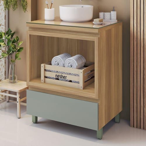 Com um grande diferencial, o Gabinete Rainha possui maior altura útil do mercado, proporcionando maior espaço para guarda de utensílios e ainda com pés menores 10cm. O pé de 10 cm, deixa com maior robustez, proporcionalidade e beleza. Projetado para proporcionar praticidade e funcionalidade no uso diário, produzida com matérias prima de alto nível e ferragens tecnológicas de última geração. Acabamento da Gaveta: Pintura Acabamento da Prateleira: Pintura Acabamento dos Pés: Pintura Acompanha Cuba: Não Acompanha Manual de Instalação: Sim Acompanha Parafusos Para Fixação Na Parede: Não Altura dos Pés: 10 cm Ambiente Principal: Cozinha Complexidade da Montagem: Média: pode ser montado por mais de uma pessoa e/ou necessite de maior conhecimento para montagem Comprimento da Prateleira: 67 cm Cor: Marrom/Verde Cor do Produto: Marrom/Verde Escala de Brilho: Fosco Escala de Brilho da Gaveta: Fosco Escala de Brilho da Prateleira: Fosco Espessura da Prateleira: 1,5 cm Furação para Cuba e Torneira: Não Gaveta com Chave: Não Itens Inclusos: 1 Gabinete, Manual de Montagem e Kit Ferragens. Manual de Montagem e Instalação: https://product-hub-prd.madeiramadeira.com.br/871341/documents/f63170b7-fe8d-4596-85f1-71823ec8d3cdinetebanheiro1gvnesher70cm.pdf Material da Gaveta: MDF Material da Prateleira: MDF Material do Tampo: MDF Material dos Pés: Polipropileno Material Principal: MDF Necessita Montagem: Sim Origem do Produto: Nacional Peso: 32,5 kg Peso Máximo por Gaveta: 5 kg Peso Máximo por Prateleira: 15 kg Possui Nichos: Não Possui Pés: 04 Possui Portas: Não Possui Prateleiras: Sim Possui Recorte No Tampo Para Cuba: Não Possui Recorte No Tampo Para Misturador: Não Possui Rodízio: Não Possui Sifão: Não Possui Tampo: Sim Produto Montado: Não Quantidade de Gavetas: 01 Recomendações de Uso, Manutenção e Limpeza: Utilizar pano macio levemente umedecido e na sequencia pano macio seco. Resistente à Chuva: Não Sapatas Niveladoras: Sim Sistema de Montagem: Parafusos, Cavilhas e Minifix. Suporta Até (kg): 30 kg Tamanho Indicado Para Cuba: 34cmx40cm Tipo de Corrediça da Gaveta: Metálica Telescópica Tipo de Gabinete: Gabinete de Chão Tipo de Móvel para o Banheiro: Gabinete de Banheiro Tipo de Puxador da Gaveta: Embutido Ean: 7909903434970