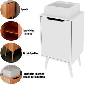 Gabinete Para Banheiro 45 Cm Cuba Quadrada 1 Porta Retrô Branco O Gabinete para Banheiro 45 cm com Cuba Quadrada e Porta Retrô é a escolha perfeita para quem deseja unir estilo e funcionalidade em um único móvel. Com design retrô marcado pelos pés palito e linhas limpas, ele traz um ar de sofisticação ao ambiente, ideal para banheiros compactos ou lavabos. Seu visual clean combina facilmente com diversos estilos de decoração, garantindo um toque elegante e contemporâneo. Dimensões do Gabinete Retrô Pés Palito para Banheiro: - Altura: 80 cm - Largura: 45 cm - Comprimento: 38,7 cm