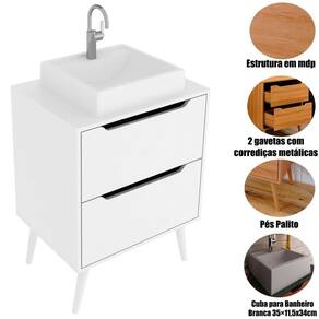 Características do Armário de Banheiro com Cuba: - Estrutura em mdp; - Acabamento em pintura UV; - 2 gavetas com corrediças metálicas; - Pés retrô palito; - Suporta 10 kg no tampo e 3 kg cada gaveta e cada prateleira; - Cuba em mármore sintético e acabamento em brilho polido; - Não acompanha torneira; - Não acompanha objetos de decoração;