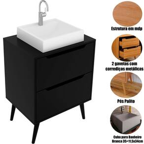 Gabinete para Banheiro 60 cm 2 Gavetas com Cuba Robin - Preto