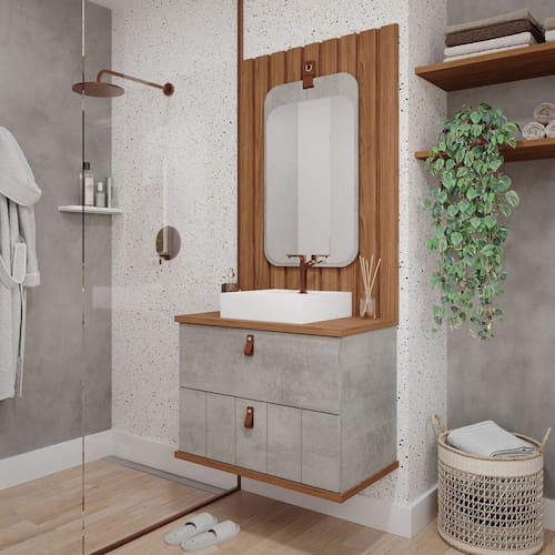 Grande ou pequeno, o banheiro da sua casa tem que ser prático, organizado e aconchegante. Um item que não pode faltar, no entanto, é inspiração. A inspiração para o Gabinete Poli vem da vida, da marromza e do conforto, que são imprescindíveis em nosso dia a dia. O Gabinete Poli possui amplo espaço interno om desgin moderno e é ideal para quem procura espaço e beleza. Aproveite e adquira já o seu Gabinete Poli para deixar seu banheiro ainda mais moderno, sofisticado e elegante. Acabamento da Cuba: Polido Acabamento da Gaveta: Pintura UV Acabamento da Porta: Pintura UV Acompanha Cuba: Sim Acompanha Parafusos Para Fixação Na Parede: Sim Ambiente Principal: Banheiro Cor: Cimento Cor da Cuba: Branca Cor do Produto: Cimento Cor Flex: Não Cor Interna: Cimento Escala de Brilho: Fosco Escala de Brilho da Gaveta: Fosco Escala de Brilho da Porta: Fosco Gaveta com Chave: Não Itens Inclusos: 01 Gabinete e 01 Cuba Linha ou Coleção: Decor Manual de Especificação Técnica: https://cdn2.madeiramadeira.com.br/atributo/mgm-moveis/1258945-7898942628962-manual.pdf Manual de Montagem e Instalação: https://cdn2.madeiramadeira.com.br/atributo/mgm-moveis/1258944-7898942628962-manual.pdf Material da Cuba: Mármore Sintético Material da Gaveta: MDF Material da Porta: MDF Material do Puxador da Gaveta: Couro Material do Puxador da Porta: Couro Material do Tampo: MDF Material Principal: MDF Medida da Cuba (C x L x P): 37 X 40 X 9,8 cm Medida do Recorte Para Misturador: 3.2 Montagem Flex: Não Necessita Montagem: Não Origem do Produto: Nacional Peso: 28,4 kg Peso Máximo por Gaveta: 3 kg Possui Nichos: Não Possui Pés: Não Possui Portas: 01 Possui Prateleiras: Não Possui Recorte No Tampo Para Cuba: Não Possui Recorte No Tampo Para Misturador: Sim Possui Sifão: Não Possui Tampo: Sim Recomendações de Uso, Manutenção e Limpeza: Utilizar pano úmido Suporta Até (kg): 15 kg Tipo de Corrediça da Gaveta: Metálica Telescópica Tipo de Dobradiça/Corrediça da Porta: Metálica Tipo de Gabinete: Gabinete Suspenso Tipo de Móvel para o Banheiro: Gabinete de Banheiro Tipo de Porta: Basculante Tipo de Puxador da Gaveta: Externo Tipo de Puxador da Porta: Externo Válvula indicada: N/D
