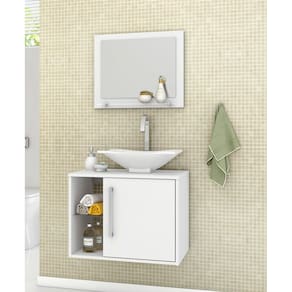 Conjunto para banheiro composto por cuba de apoio em mármore sintético, espelheira e gabinete, elaborado em MDP com espessuras de 12 mm e 15mm. Pintura da superfície em verniz poliéster brilhante, com secagem UV e impressão a laser. Acabamento nas bordas com fita de papel decorativo aplicado mecanicamente por sistema hot melting. Prateleiras de vidro de 4mm, puxador de plástico com acabamento cromado, dobradiças metálicas.