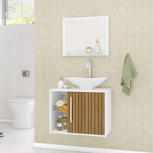 Conjunto para banheiro composto por cuba de apoio em mármore sintético, espelheira e gabinete, elaborado em MDP com espessuras de 12 mm e 15mm. Pintura da superfície em verniz poliéster brilhante, com secagem UV e impressão a laser. Acabamento nas bordas com fita de papel decorativo aplicado mecanicamente por sistema hot melting. Prateleiras de vidro de 4mm, puxador de plástico com acabamento cromado, dobradiças metálicas.
