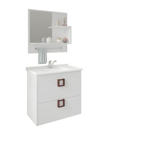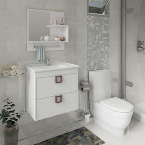 O Gabinete Para Banheiro Com Lavatório E Espelho Lírio Branco MGM Móveis 59cm oferece praticidade e sofisticação ao banheiro. Com porta basculante de abertura a pistão à gás e gaveta com corrediça telescópica, ele garante funcionalidade e fácil acesso. A espelheira possui duas prateleiras e toalheiro em alumínio, complementando o design moderno. Estrutura em MDF e lavatório de mármore sintético asseguram durabilidade. Confira na ABC da Construção e conheça o Gabinete Para Banheiro Com Lavatório E Espelho Lírio Branco MGM Móveis 59cm, o armário/gabinete para banheiro ideal para sua casa!