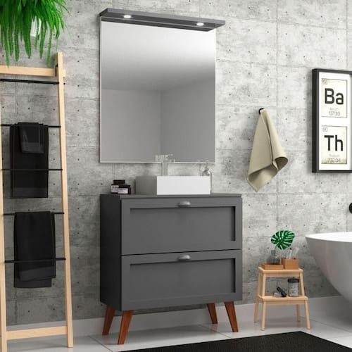 O conjunto acompanha um espelho retangular elegante, que harmoniza perfeitamente com a estética retrô do gabinete, deixando o banheiro ainda mais sofisticado e aconchegante.