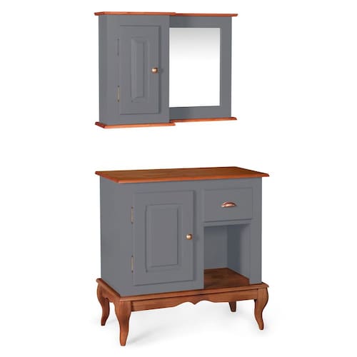O Gabinete de Banheiro 80cm é a solução completa para seus desafios de armazenamento. Com uma portas, prateleira e nicho, ele oferece espaço amplo para guardar seus itens essenciais, mantendo tudo no lugar certo. Com o aéreo com espelho sua imagem é refletida com clareza, enquanto a sua porta garante um espaço especialmente para organizar seus itens pessoais. Produzidos em Madeira Maciça para tons amadeirado em verniz e MDF nos tons coloridos com acabamento laca, esse gabinete é sinônimo de qualidade e durabilidade. Além disso, possuí pés no estilo Luis XV, dando um toque clássico ao móvel.
