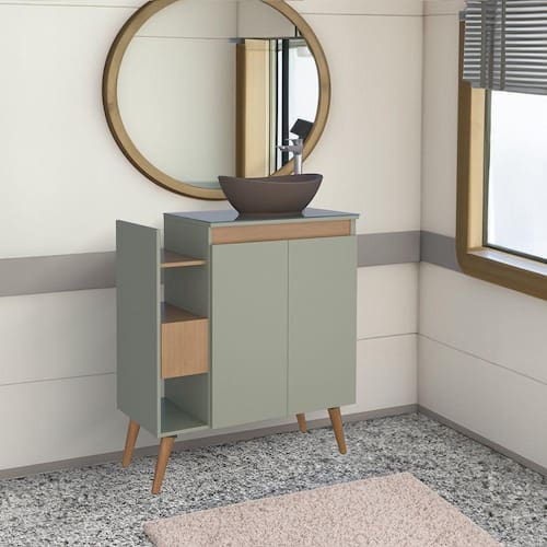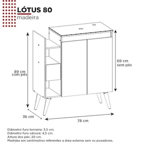O toucador em madeira para banheiro Lótus 80, da Cozimax, é a melhor opção para quem busca um produto com estilo e qualidade. Fabricado com chapas de madeira MDP, protegido por uma superfície melamínica, possui tampo de vidro temperado, duas portas com espaço interno para guardar os produtos de higiene, gaveta com corrediças telescópicas, dois nichos, pés em madeira. Acabamento da Gaveta: Pintura Acabamento da Porta: Pintura Acompanha Cuba: Não Acompanha Parafusos Para Fixação Na Parede: Não Altura dos Pés: 20 cm Ambiente Principal: Banheiro Complexidade da Montagem: Baixa: pode ser montado por uma pessoa sozinha Cor: Jequitibá/ Verde Cor do Produto: Jequitibá/ Verde Escala de Brilho: Fosco Escala de Brilho da Porta: Fosco Gaveta com Chave: Não Itens Inclusos: 1 Gabinete, kit ferragens e manual de montagem Linha ou Coleção: Lótus 80 Manual de Montagem e Instalação: https://cdn2.madeiramadeira.com.br/atributo/cozimax/1394989-1367-manual-toucador-lotus-80-com-pes-exp.pdf Material da Gaveta: MDP Material da Porta: MDP Material do Tampo: MDF Material dos Pés: Madeira Maciça Material Principal: MDP Medida do Recorte Para Misturador: 2,5cm Necessita Montagem: Sim Origem do Produto: Nacional Peso: 23 kg Peso Máximo por Gaveta: 5 kg Possui Nichos: 02 Possui Pés: 04 Possui Portas: 02 Possui Prateleiras: Não Possui Recorte No Tampo Para Cuba: Não Possui Recorte No Tampo Para Misturador: Sim Possui Rodízio: Não Possui Sifão: Não Possui Tampo: Sim Recomendações de Uso, Manutenção e Limpeza: Pano Umedecido Sapatas Niveladoras: Não Sistema de Montagem: Parafusos Suporta Até (kg): 15 kg Tamanho Indicado Para Cuba: 30cmx30cm Tipo de Corrediça da Gaveta: Metálica Telescópica Tipo de Dobradiça/Corrediça da Porta: Metálica Tipo de Gabinete: Gabinete de Chão Tipo de Madeira Maciça dos Pés: Pinus Tipo de Móvel para o Banheiro: Gabinete de Banheiro Tipo de Porta: Bater Tipo de Puxador da Gaveta: Embutido Tipo de Puxador da Porta: Embutido