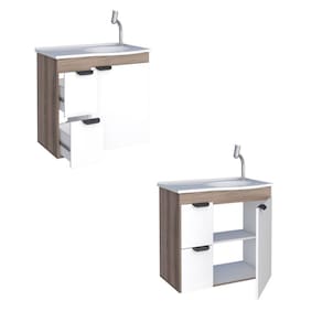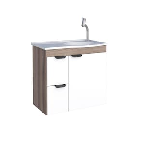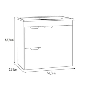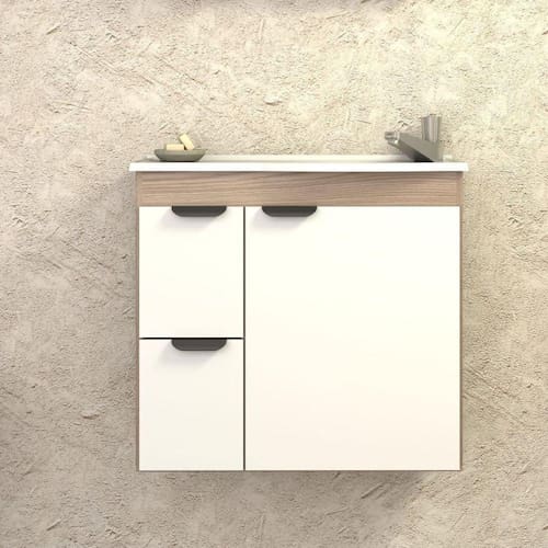 O Gabinete em madeira para banheiro Margarida, da Cozimax, ideal para manter tudo bem arrumado em seu banheiro. Fabricado com chapas de madeira, protegido por uma superfície melamínica, possui lavatório em mármore sintético com linhas curvas, duas gavetas e um espaço interno para guardar os produtos de higiene e limpeza, puxador em aço com formato minimalista.