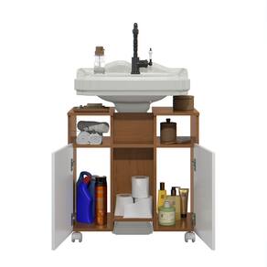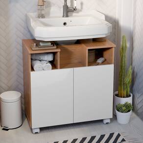 Gabinete para Banheiro para Pia de Coluna com Portas e Nichos Abertos – Organizador Moderno para Debaixo da Pia Pintura 3D Efeito Ripado - Branco | Cinamomo