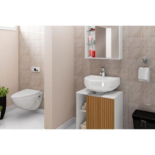 Gabinete de Coluna 1 Porta Pequin Móveis Bechara O Gabinete Pequin é ideal para você que possui um lavatório de coluna! Seu design permite que ele fique acoplado ao lavatório. Possui também rodízios que facilitam a locomoção caso necessário, e com isso dispensa a fixação na parede. Possui uma porta com 4 nichos internos e 2 nichos ao lado da porta. Possui amplo espaço proporcionando várias opções para organizar seus pertences. O Puxado é uma chapa de alumínio discreta e elegante na parte superior da porta. Necessita Montagem Não Possui Gavetas Não Possui Prateleiras 03 Ambiente Banheiro Cor Predominante Marrom Material Principal MDP Rodízio com Trava Não Linha ou Coleção Pequin Link Manual de Montagem Clique aqui para baixar Possui Portas 01 Estilo Contemporâneo Cor Madeira Rústica/3D Suporta até (kg) 10 kg Recomendações de Uso, Manutenção e Limpeza Recomenda-se limpar o produto com flanela ou pano macio seco, não utilizar produtos abrasivos, desengordurantes, álcool ou solvente. Mantê-lo em lugar livre de umidade e/ou exposição direta ao sol. Possui Rodízio Sim Tipo de Porta Bater Possui Pés 04 Acompanha Cuba Não Material da Prateleira MDP Acabamento da Prateleira Pintura UV Escala de Brilho da Prateleira Semi-Brilho Material da Porta MDP Acabamento da Porta Pintura UV Material dos Pés Plástico Acabamento dos Pés Pintura Escala de Brilho da Porta Semi-Brilho Tipo de Dobradiça/Corrediça da Porta Metálica Sapatas Niveladoras Não Tipo de Puxador da Porta Embutido Profundidade 37,5 cm Cor Interna Madeira Rústica Altura dos Pés 5 cm Largura 55,3 cm Acabamento Pintura UV Garantia 03 meses Altura 61,5 cm Peso 12,9 kg Itens Inclusos 1 Gabinete de Coluna e Manual de Montagem.