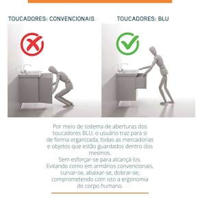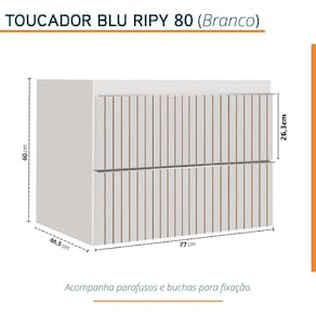 Produto fabricado em MDP PF (15mm), com ripas autênticas fabricadas em HDF BP (06mm), na largura de 20mm. Puxadores de alumínio anodizado; caixaria estruturada com cantoneiras metálicas; gavetas com corrediças telescópicas proporcionando abertura total das mesmas; gaveta com divisores e higiênico organizador dental (removível e lavável); e gaveta interna com manta anti-derrapante, protegendo o fundo da mesma. Acompanha parafusos buchas para fixação na parede. Possui manual de instalação. Ideal para compor com o Lavatório 80 da Marca BLU LAVATÓRIOS (vide site do Madeira Madeira). Produto sai montado de fábrica, devidamente regulado, bastando apenas fixá-lo na parede. Garantia de 12 meses para defeito de fabricação.