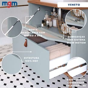 que tal o gabinete de banheiro veneto?perfeito para organizar sua suíte ou lavabo com muita pde, o gabinete veneto foi projetado para otimizar o espaço e deixar os momentos de cuidados pessoais ainda hores. com uma estrutura funcional e compartimentos bem distribuídos, ele acomoda todos os seus itens de higiene e beleza, mantendo tudo em ordem e ao alcance, além de contar com design charmoso que adiciona um toque de prersonalidade à decoração. com ele, a rotina se torna mais fluida e agradável, do jeitinho que seu dia a dia pede. Marca: Modern