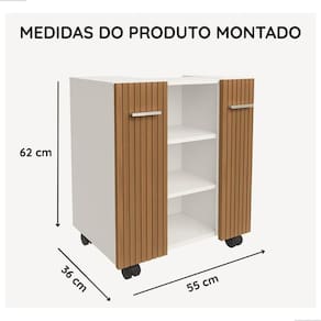Cor: branco | Altura: 62 cm | Largura: 55 cm | Profundidade: 36 cm | Comprimento: 36 cm | Material: MDP | Inclui Manual de Montagem: Sim | Requer Montagem: Sim | Quantidade de caixas de Embalagem: 2 | Inclui espelho: Não | Inclui pia: Não | Cor: Branco Ripado