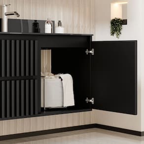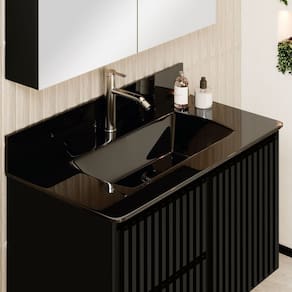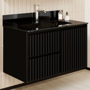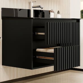 O Gabinete Ripado Vision, que dá beleza e maior resistência ao seu produto, puxadores em cava 45º, dando estilo e leveza ao ambiente, gavetas com corrediças telescópicas e sistema SLOW de fechamento suave, também possui divisórias internas que facilitam a organização de seu banheiro, conta com uma bancada de vidro moldada 10mm que dá maior sofisticação.