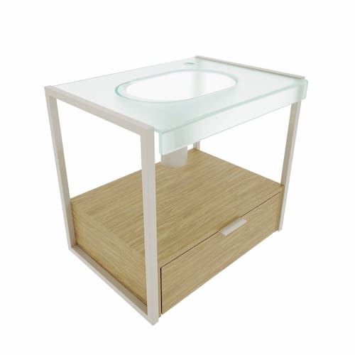 Gabinete Roma Incolor Jateado 87cm - Cris-Metal - Estrutura da Gaveta em MDF com corrediças telescópicas. Tampo de vidro com cuba moldada espessura de 8cm. Tubos Estruturais de alumínio com pintura eletrostática. Suporte da torneira.