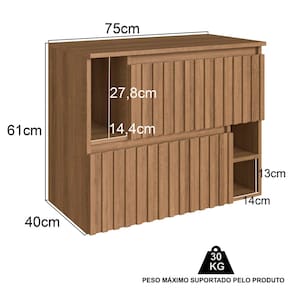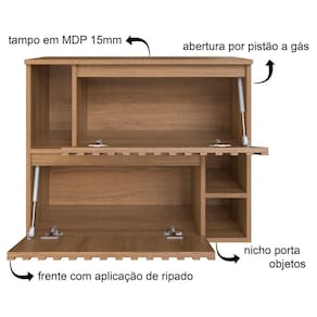 Características adicionais: Balcão com 2 portas e ripado aplicado, abertura com pistão a gás, 3 nichos externos, dobradiças metálicas