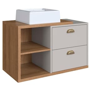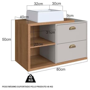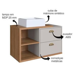 Nada mais agradável que ter um Balcão Gabinete no seu banheiro que combine estilo e funcionalidade. Este móvel possui uma cuba em mármore sintético, duas gavetas com corrediças metálicas, dois nichos acessíveis e puxadores elegantes em *formato de concha*. A furação para instalação da válvula da cuba deve ser realizada durante a montagem. Este móvel chegará na sua casa separado em 02 volumes.