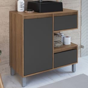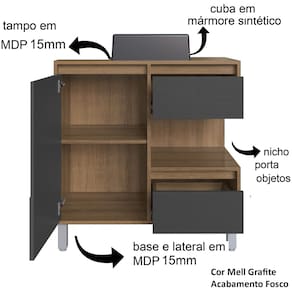 Características adicionais: acompanha 1 cuba em mármore sintético, 1 porta, 2 gavetas, 1 nicho externo, dobradiças e corrediças metálicas, pés em ABS reguláveis
