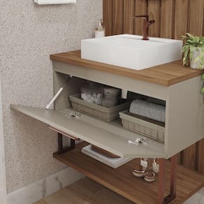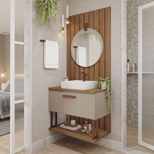 Características: Estrutura em MDF Acabamento em Pintura UV Puxador em cobre fosco 01 Porta com pistão à gás Dobradiças metálicas Acompanha cuba em mármore sintético Acompanha espelho com alça de couro