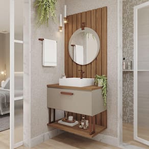 Características: Estrutura em MDF Acabamento em Pintura UV Puxador em cobre fosco 01 Porta com pistão à gás Dobradiças metálicas Acompanha cuba em mármore sintético Acompanha espelho com alça de couro
