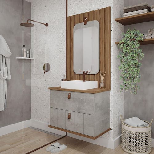 Características: Estrutura em MDF Acabamento em Pintura UV Puxadores e alça em couro 01 Porta com pistão à gás e dobradiças metálicas 01 Gaveta com corrediças telescópicas Acompanha cuba em mármore sintético Acompanha espelho Acompanha painel ripado