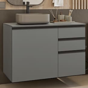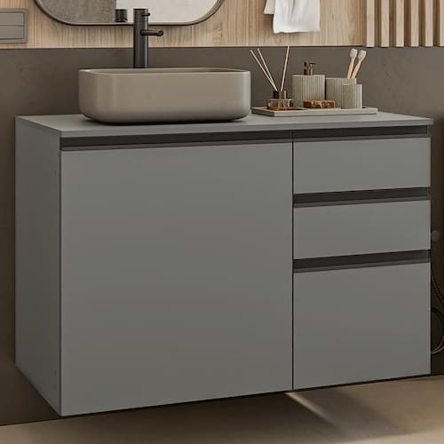 Com um design moderno, o balcão é composto por uma porta e três gavetas espaçosas, perfeitas para guardar produtos de higiene, toalhas e acessórios com praticidade.