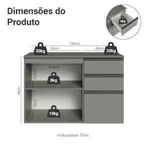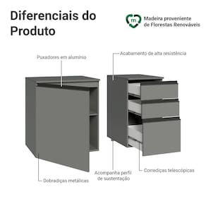 Produzido com materiais de qualidade, possui dobradiças metálicas nas portas e puxadores em perfil de alumínio, garantindo resistência. As gavetas possuem corrediças que permitem abertura total e o acabamento é de alta resistência, garantindo durabilidade.