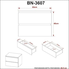 Quando falamos de banheiro pensamos em bem-estar. Pois o banheiro é onde a gente recarrega nossa energia vital, idealiza sonhos, e realiza toda a manutenção necessária para uma saúde física e mental. Com design prático, o móvel entrega ao ambiente toques de modernidade e elegância. Funcional, acondiciona produtos de higiene e beleza, porta escova, papel higiênico, toalhas, artigos de limpeza, entre tantos outros objetos pessoais. Balcão Gabinete Suspenso para Banheiro BN3607. Possui duas gavetas, estrutura em MDP e acabamento em pintura UV. O produto não acompanha cuba.