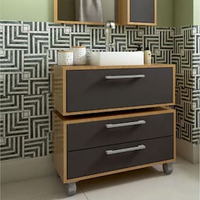 O gabinete suspenso com balcão para banheiro Alice, da Faema, possui gabinete com uma porta basculante com amplo espaço interno. Possui também um balcão baixo com rodízios que facilitam a movimentação do móvel na hora da limpeza e 2 gavetas. Acompanha cuba branca. Transforme seu banheiro em um espaço funcional e ao mesmo tempo lindo! Acabamento da Cuba: Liso Acabamento da Gaveta: Finish Foil Acabamento da Porta: Finish Foil Acabamento dos Pés: Liso Acompanha Cuba: Sim Acompanha Manual de Instalação: Sim Acompanha Parafusos Para Fixação Na Parede: Sim Altura dos Pés: 10 Ambiente Principal: Banheiro Complexidade da Montagem: Média: pode ser montado por mais de uma pessoa e/ou necessite de maior conhecimento para montagem Cor: Mel/Grafite Cor da Cuba: Branca Cor do Produto: Mel/Grafite Cor Interna: Mel Escala de Brilho: Fosco Escala de Brilho da Gaveta: Fosco Escala de Brilho da Porta: Fosco Furação para Cuba e Torneira: Não Gaveta com Chave: Não Itens Inclusos: 1 Gabinete, Kit Ferragens e Manual de Montagem Linha ou Coleção: Banheiro Manual de Montagem e Instalação: https://product-hub-prd.madeiramadeira.com.br/874020/documents/aed15f92-ad31-466f-9a2b-bb4e839e3d47086278987449503775cjbl2012.pdf Material da Cuba: Mármore Sintético Material da Gaveta: MDP Material da Porta: MDP Material do Puxador da Gaveta: ABS Material do Puxador da Porta: ABS Material do Tampo: MDP Material dos Pés: ABS Material Principal: MDP Medida da Cuba (C x L x P): 9x32x30 Necessita Montagem: Sim Origem do Produto: Nacional Pés Reguláveis: Não Peso: 32,9 kg Peso Máximo por Gaveta: 10 Possui Nichos: Não Possui Pés: 04 Possui Portas: 01 Possui Prateleiras: Não Possui Recorte No Tampo Para Cuba: Não Possui Recorte No Tampo Para Misturador: Não Possui Rodízio: Sim Possui Sifão: Não Possui Tampo: Sim Produto Montado: Não Quantidade de Gavetas: 02 Recomendações de Uso, Manutenção e Limpeza: Para a limpeza do móvel utilizar pano levemente umedecido com água Resistente à Chuva: Não Rodízio com Trava: Sim Sapatas Niveladoras: Não Sistema de Montagem: Parafusos, cavilhas e minifix Suporta Até (kg): 20 Suporte para Toalheiro: Não Tipo de Corrediça da Gaveta: Metálica Simples Tipo de Dobradiça/Corrediça da Porta: Metálica Tipo de Gabinete: Gabinete com Rodízio Tipo de Móvel para o Banheiro: Gabinete de Banheiro Tipo de Porta: Basculante Tipo de Puxador da Gaveta: Externo Tipo de Puxador da Porta: Externo Válvula indicada: Válvula padrão Ean: 7909903453247