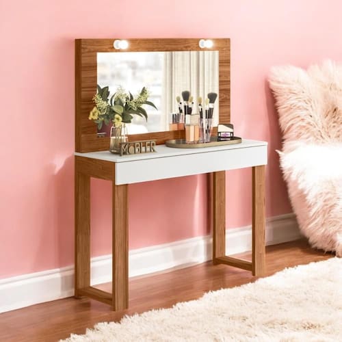 A Escrivaninha Penteadeira possui um amplo espelho iluminado por LEDs.
