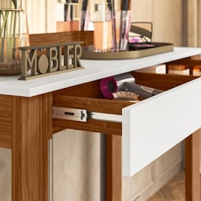 A Escrivaninha Penteadeira possui um amplo espelho iluminado por LEDs.
