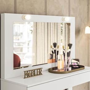 A Escrivaninha Penteadeira possui um amplo espelho iluminado por LEDs.