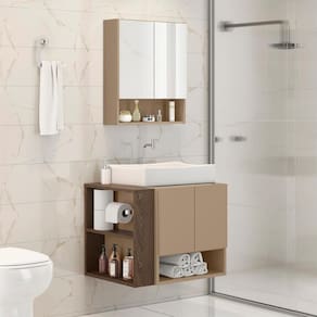 Com a cuba de design elegante, nichos laterais práticos e armário com espelho, ele une sofisticação e organização em um só produto.
