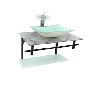 dados técnicos itens inclusos: - bancada de vidro temperado com furo para instalação da torneira 3,5cm diâmetro e da válvula click 4,5cm diâmetro - cuba de vidro retangular - suporte preto, resistente a umidade extrema e não enferruja - kit parafusos completo para instalação - prateleira de vidro - válvula click.