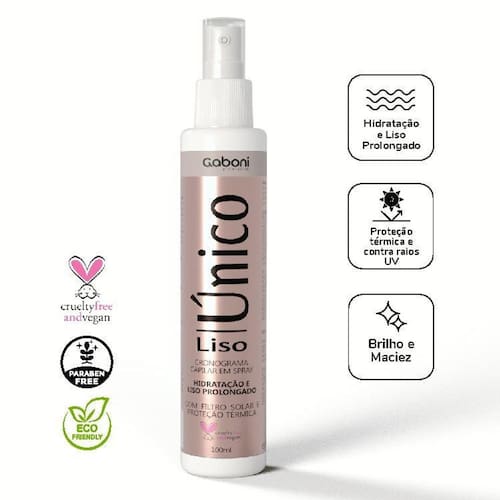 Gaboni Cronograma Capilar Spray Hidratacao Liso Unico 100ml O novo Cronograma Capilar Hidratação Liso Unico 100ml da Gaboni repõe a água do cabelo. Indicado para cabelos sem brilho, quimicamente tratados ou naturais.